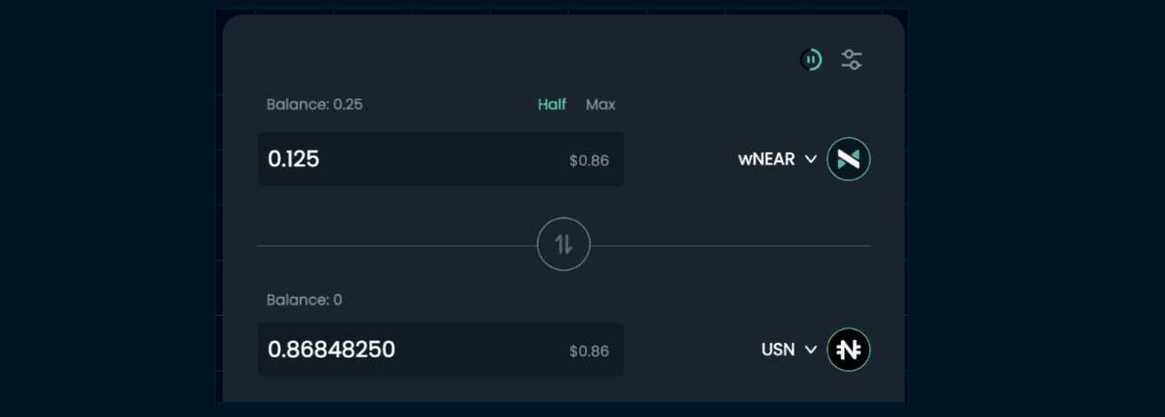 Example: Step 1: Head to swap on https://app.ref.finance/ Step 2: Swap your token for 50/50 USN and USDT, if you plan on using the whole balance of your token for LP, you can select “half” to swap exactly 50%. If you swap into USN/USDT from another stablecoin you can use the stable swap option as well.