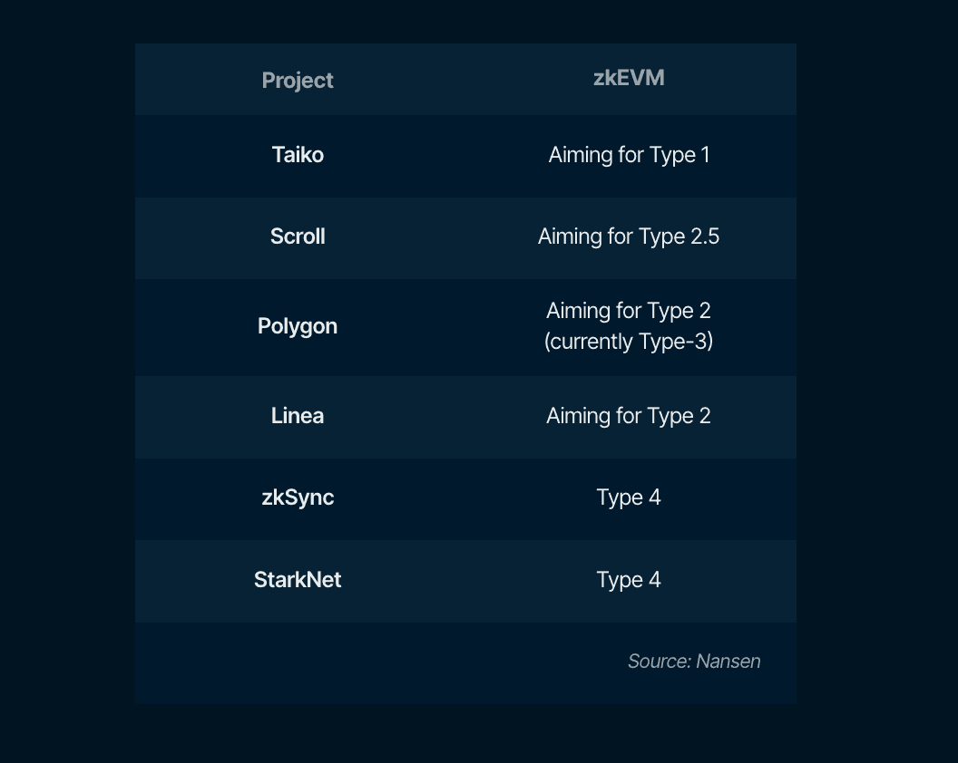 Polygon ZK and Linea are building towards a Type 2 zkEVM. Current implementations are more like a Type 3 zkEVM at present as they haven’t implemented several very complex precompiles yet. All these networks are a work in progress, and it will be interesting to see if they can find feasible paths toward EVM-equivalence.