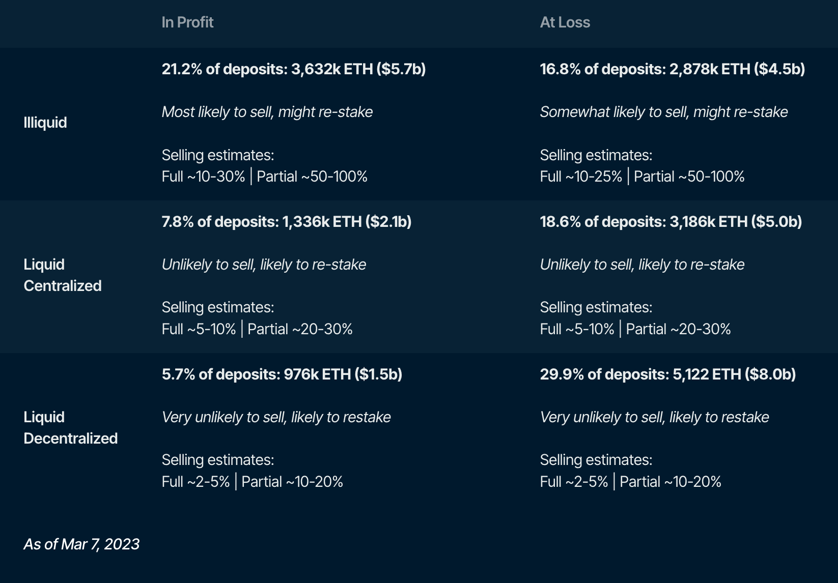 Illiquid stakers account for 38% of total staked ETH. These stakers are most likely to sell after the unlock. Capital has likely been locked for a significant amount of time, as illiquid staking was dominant, especially in the early days of the beacon chain. They might want to sell some of the unlocked ETH for various reasons, which might include: