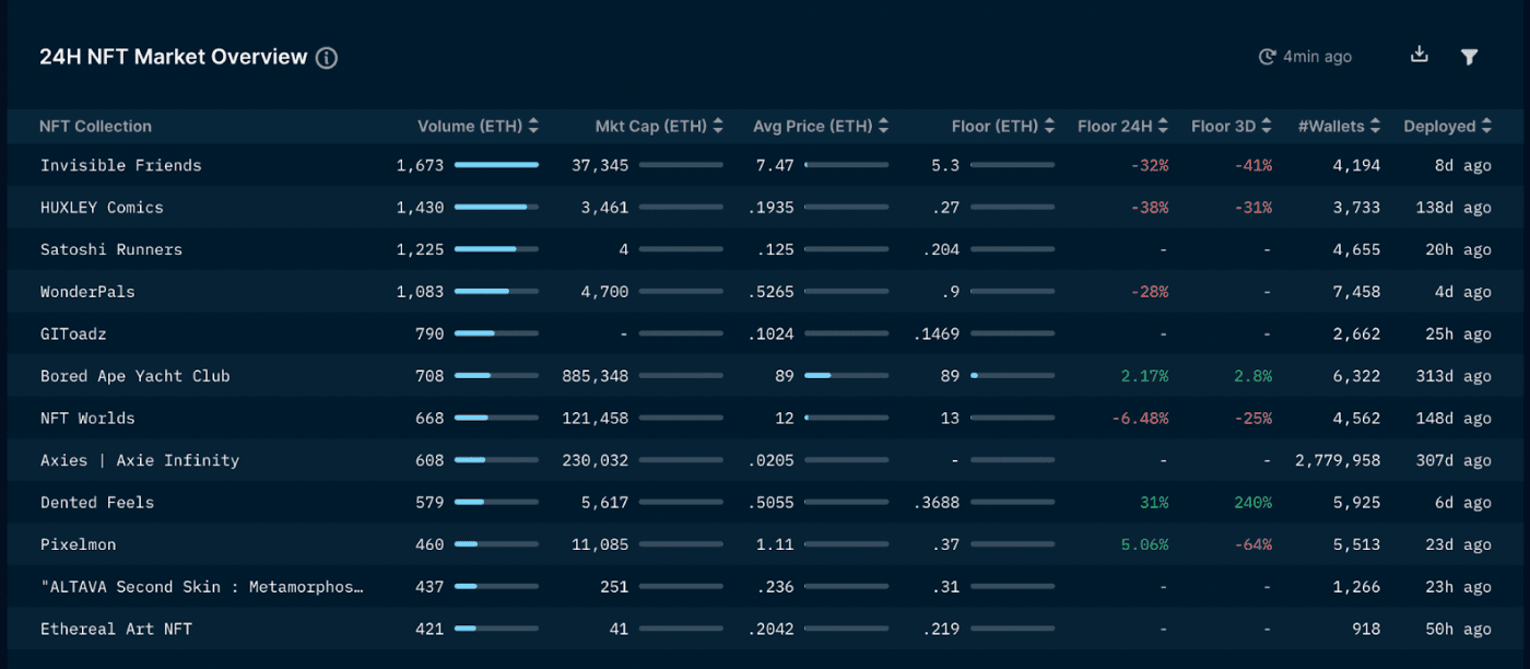 - Invisible Friends’s 0.25 ETH mint shot up to 14 ETH instantly with ~6000 ETH ($14.4M) traded in just 4 hours. Right after reveal, the floor dipped to 6.9 ETH, with unique addresses down 289, and 36 Smart Money holders. Invisible Friends is interesting, in a sense that the artwork is not a typical PFP NFT, hence, it is strategically harder for this project to earn memetic value in the crypto space. Most of the existing projects work well because of the social movement they have created in PFP collections. Hint: Azuki, BAYC, Cool Cats, etc. (Disclaimer that the price floor was highly volatile post-reveal, which attracted many paperhands)