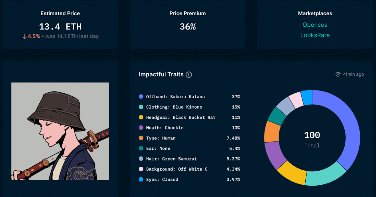 Nansen’s price estimate feature is a gem when finding underpriced NFTs. How the price estimate mode is set up is through using past sales data to calculate a price estimate for each NFT and compare it with listed price to detect which listings are undervalued.