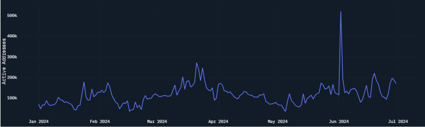 The trajectory of active addresses closely mirrors that of transactions. Active addresses show a gradual increase, with notable fluctuations around 200k to 300k daily active addresses. The most significant event is a spike to 500k daily active addresses in early June. This increase is attributed to the popularity of the tap-to-earn game Tapos Cat. Overall, the data suggests a steady upward trend in user activity, punctuated by this brief surge in June.