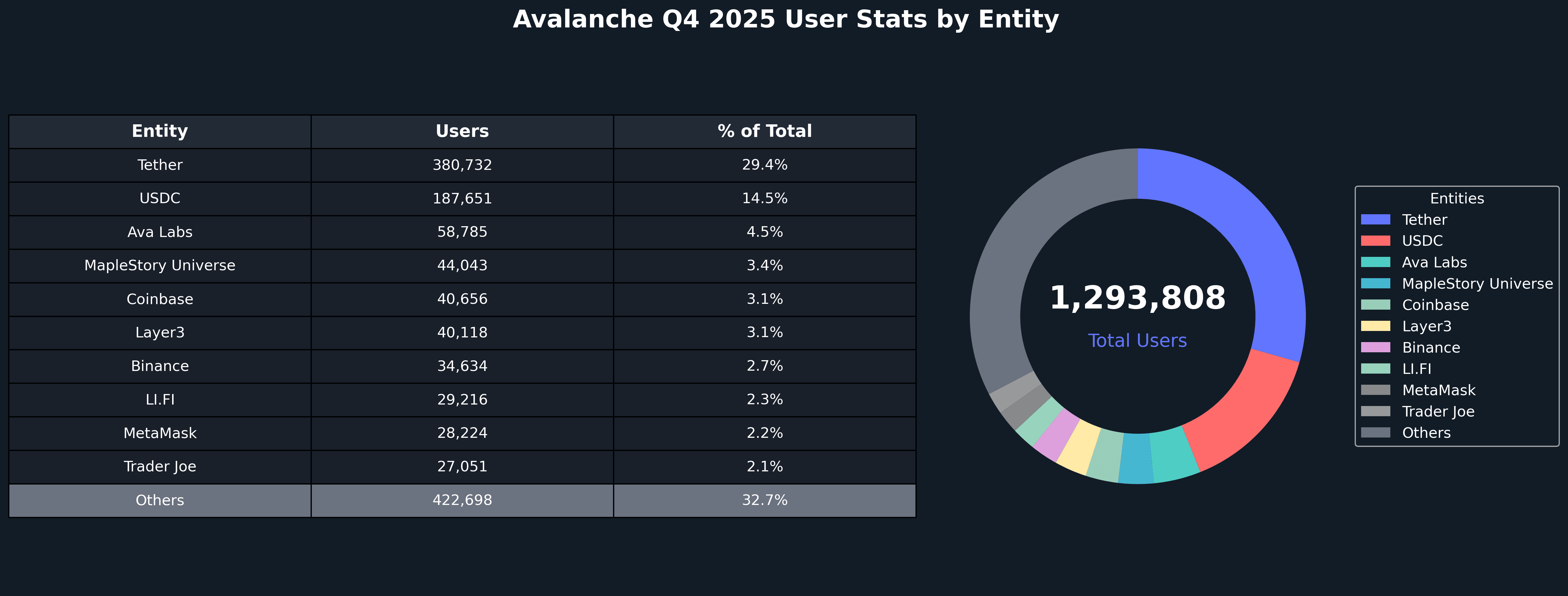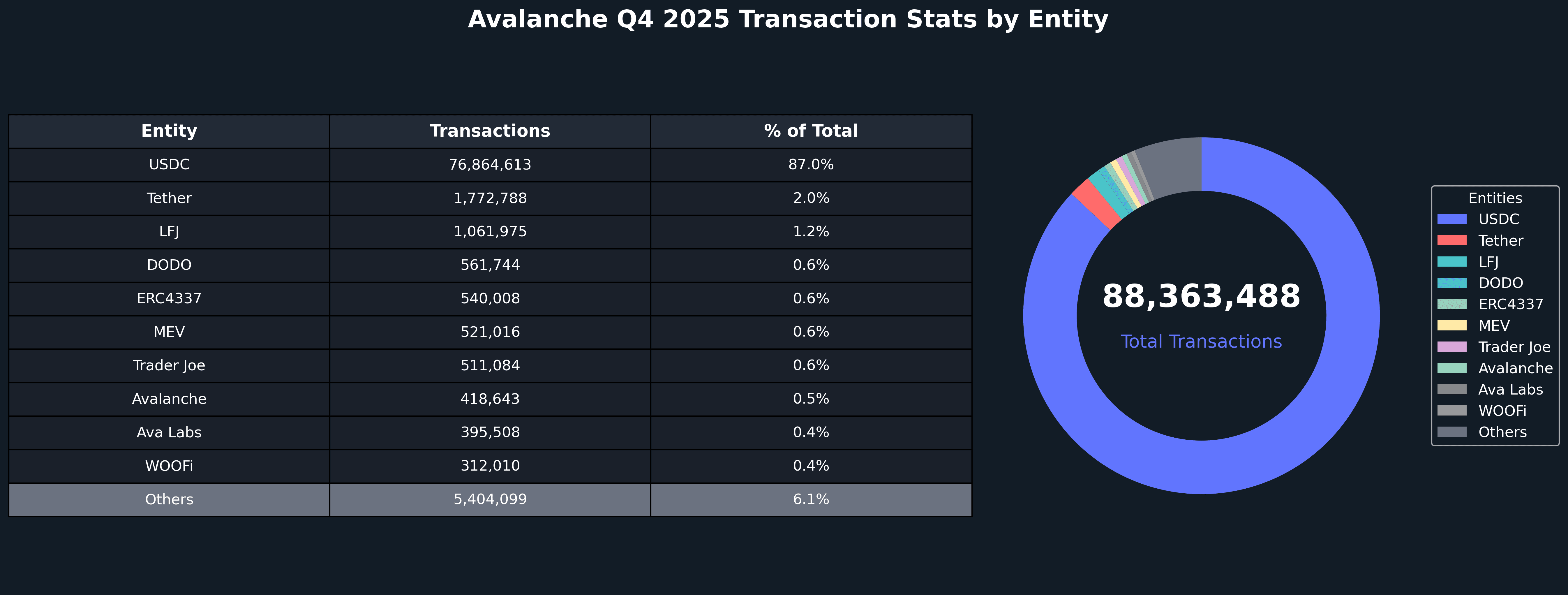 Avalanche C-chain's top entities by users and transactions highlight a mature ecosystem anchored by stablecoin infrastructure, DeFi protocols, and cross-chain infrastructure. USDC dominated transaction volume with 76.9 million transactions (87% of total), representing a 64.58% quarter-over-quarter increase that reflects the growing importance of stablecoin rails for enterprise applications like Record Financial's music royalty platform and Sierra Protocol's yield token. Tether led in user activity with 380,732 unique users (29.4% of total), showing a 12.36% QoQ increase, while LFJ demonstrated strong growth with 63.59% transaction growth despite a user decline, indicating increased engagement from existing users. Infrastructure protocols showed remarkable expansion: ERC4337 (account abstraction) saw 1,820% transaction growth, while Chainlink grew 35.14% as oracle infrastructure becomes critical for RWA and enterprise applications. The ecosystem's distribution reinforces Avalanche's dual role as both a high-performance DeFi platform and an enterprise-grade blockchain for real-world asset tokenization, with stablecoins serving as the foundational layer for institutional adoption and cross-border payments.