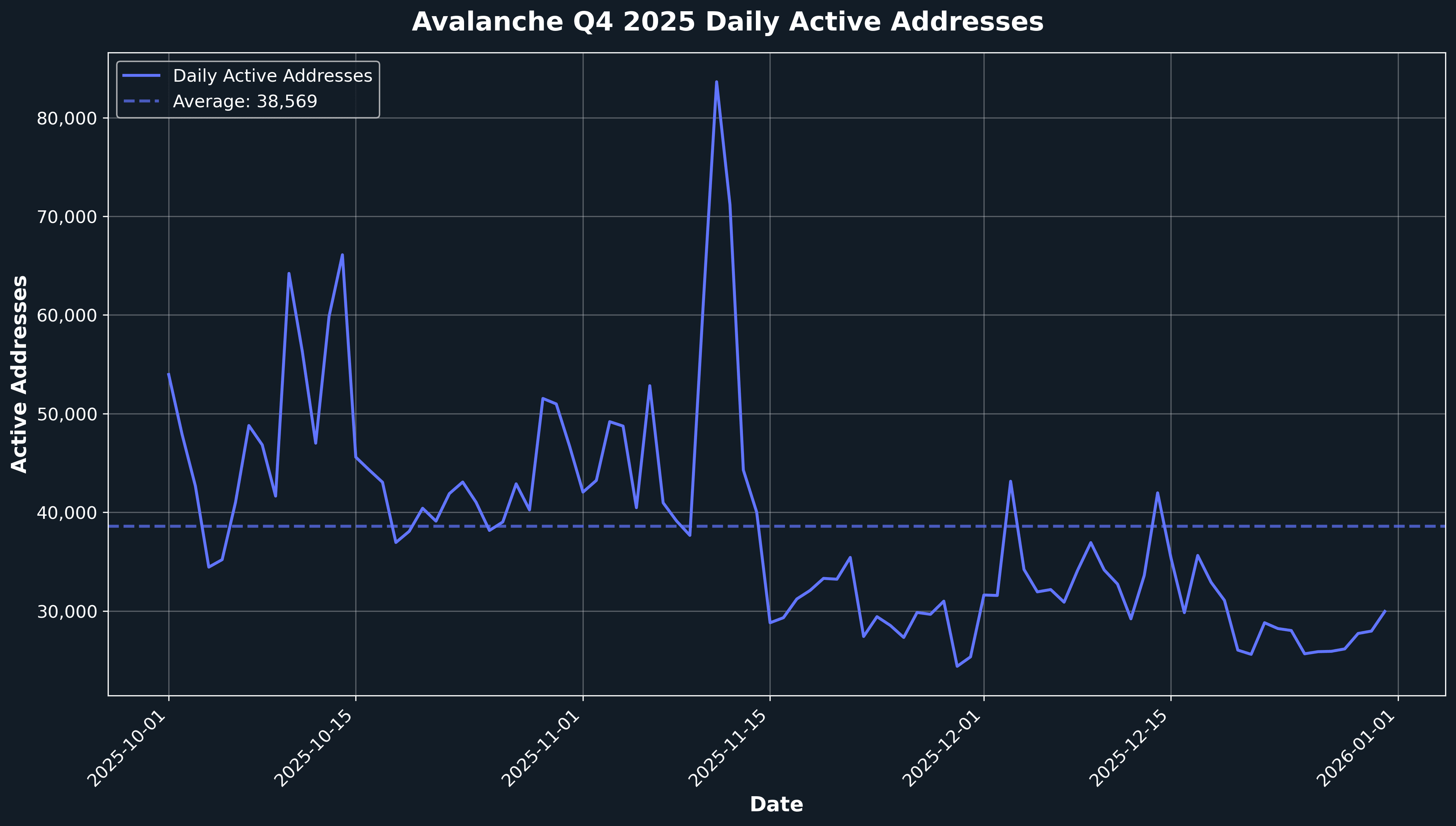 Avalanche C-chain maintained a healthy base of active addresses throughout Q4 2025, averaging 38,569 daily active addresses with peaks reaching 83,636. The quarter showed periodic surges in user activity, particularly in early October and mid-November, which aligned with ecosystem developments including MyPrize's social casino launch, the Union Square Holiday Market payment integration, and MENA regional expansion initiatives. These activity spikes demonstrate growing user engagement across diverse use cases, from gaming and entertainment to enterprise payments and financial services. The consistent user base reflects Avalanche C-Chain’s expanding appeal across multiple sectors, from DeFi protocols like Sierra and LFJ to enterprise applications like the Digital Liquidity Gateway and music royalty infrastructure. As the network continues to onboard new partnerships and protocols, user activity patterns suggest sustained ecosystem growth and diversification.