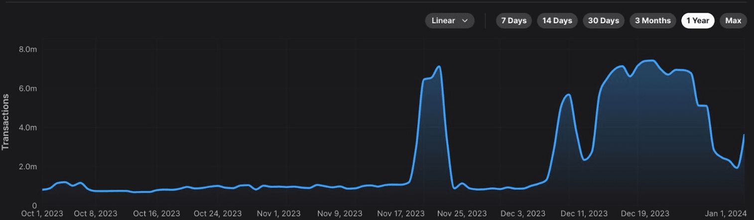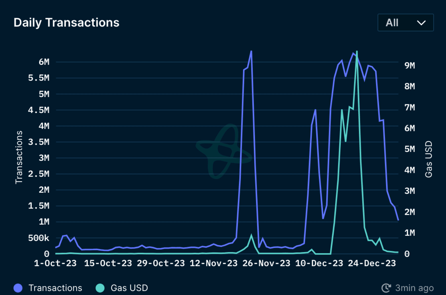 The sudden spike in late November's activity was due to ASC-20 inscriptions. These inscriptions, akin to those in Bitcoin, allowed users to attach any data to AVAX tokens by utilizing the extra data space in each transaction, called Call Data. While this increase in activity was notable, it proved short-lived, as both transactions and fees normalized to their average levels in less than a week. Additionally, December saw a sustained high level of transactions and gas usage, likely driven by two main factors: the overall improvement and returning activity in the industry.