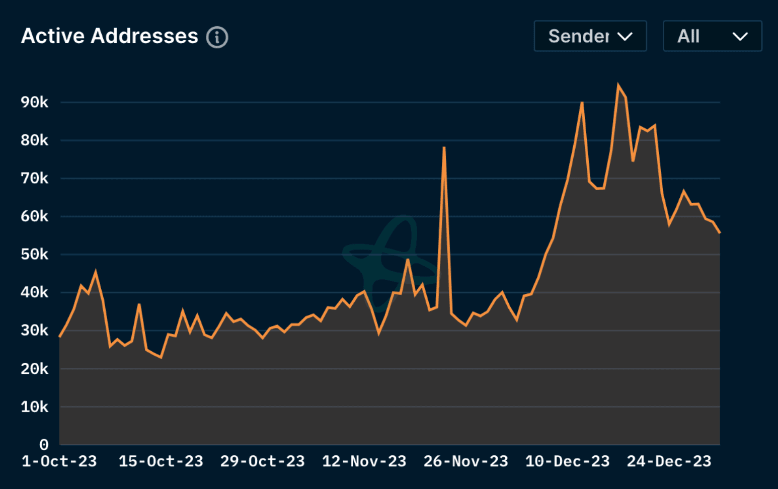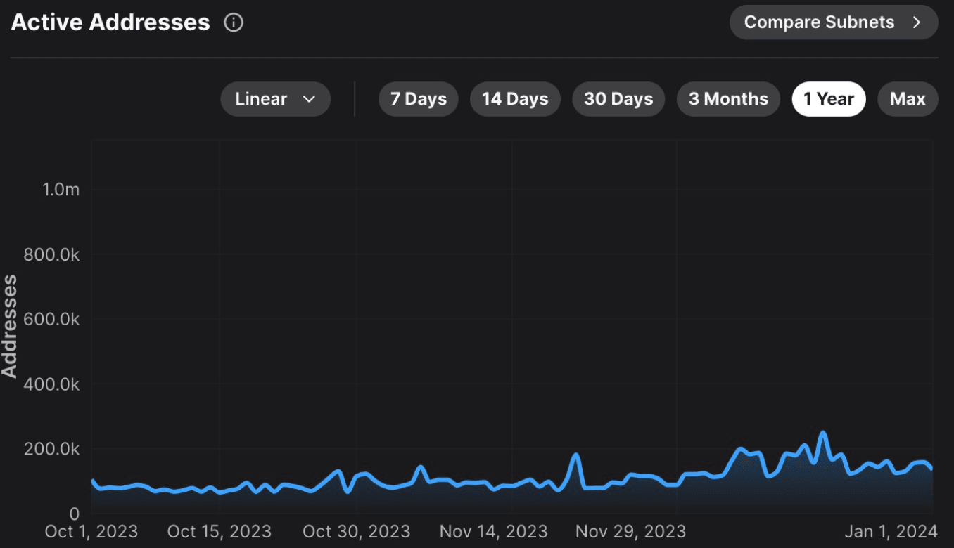During Q4 2023, Avalanche's C-Chain experienced a significant increase in user activity, with daily active addresses peaking at 95k and fluctuating between 23k and 95k. This upward trend marked an improvement from Q3, where daily active addresses ranged from 27k to 86k. The notable spike in active addresses can likely be attributed to the introduction of ASC-20 inscriptions and overall industry recovery, as previously discussed.