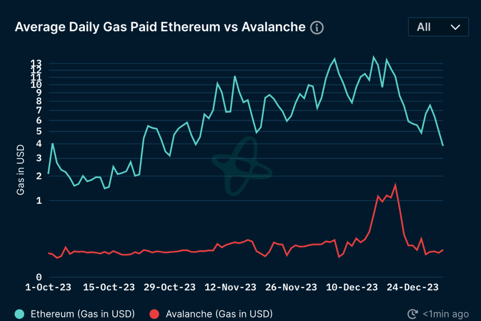 In Q4 2023, the average daily gas fee on Avalanche varied between $0.03 and $1.57, in stark contrast to Ethereum, where the gas fees were considerably higher, ranging from $1.45 to a peak of $14. Unlike Ethereum, which showed an overall upward trend in gas fees throughout the quarter, Avalanche's daily gas fees showed a relatively sideways trend, surging only in December, reaching nearly 10 times its usual average.
