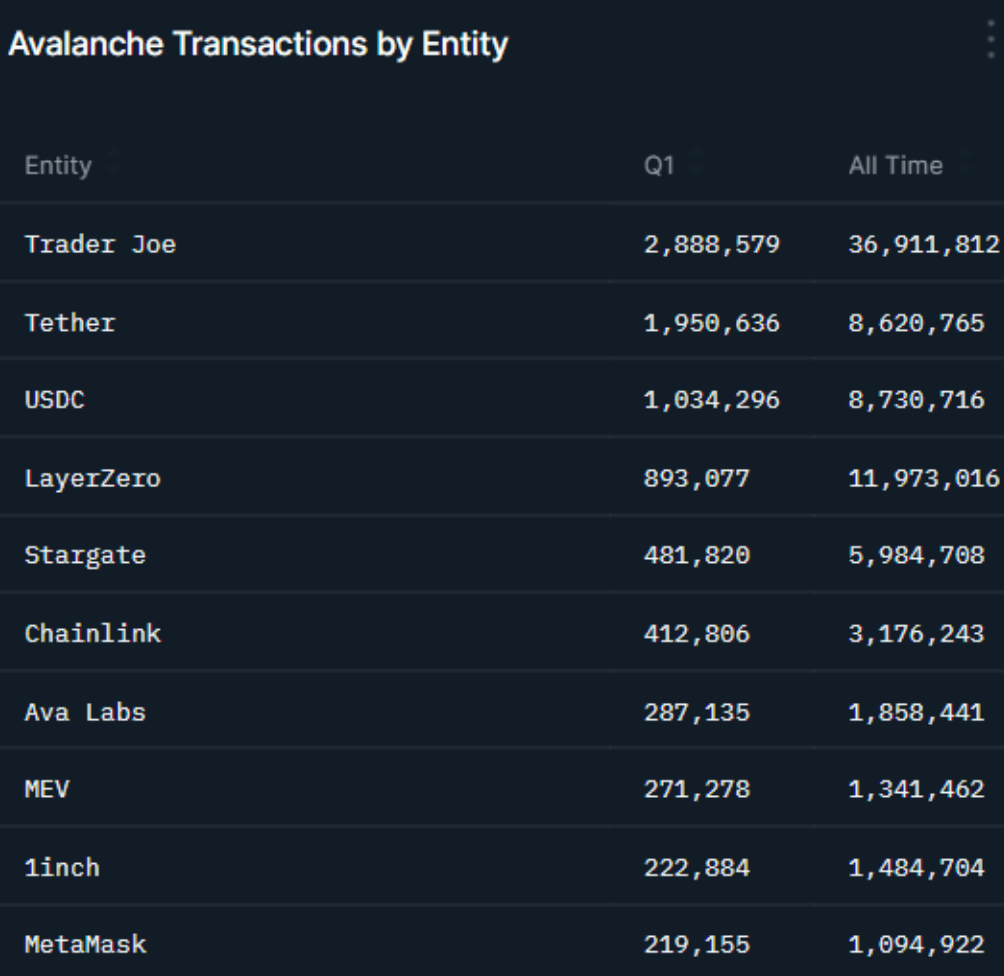 Nansen's list of labels provides a comprehensive way to analyze the top entity interactions on Avalanche based on the number of users and transactions. Trader Joe maintained the top position in the number of transactions at 2.89m, followed by Tether at 1.95m, and USDC reclaiming the third position at 1.03m. By analyzing these entity interactions, we can better understand the behavior and trends of different entities on the Avalanche network.