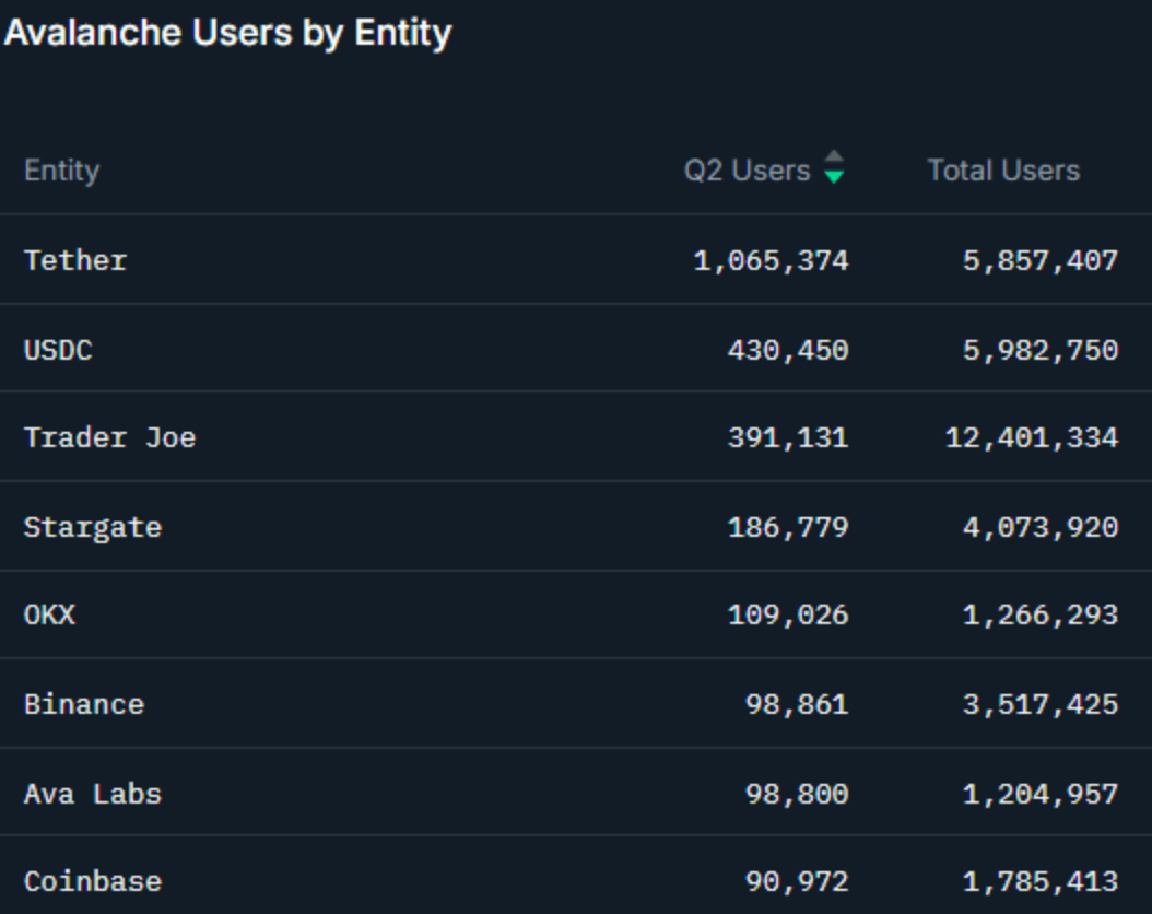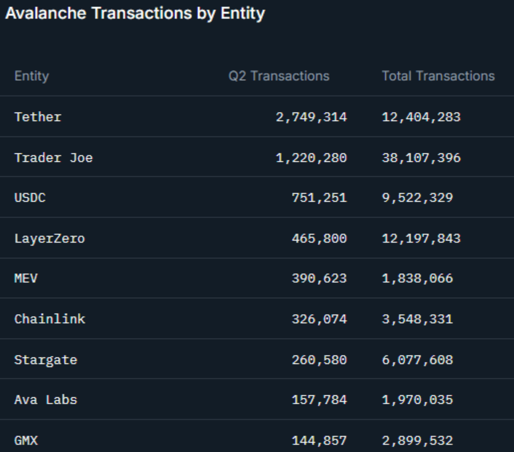 Nansen's label data provides a comprehensive view of top entity interactions on the Avalanche C-Chain, based on user activity and transaction volume. In Q2, Tether overtook Trader Joe as the leading entity with 2.7 million transactions and 1.1 million users. USDC ranked second with 430,000 users, while Trader Joe dropped to third with 391,000 users. The C-Chain remains a dominant network for financial dApps. By analyzing these interactions, we gain deeper insights into the behavior and trends of key entities on the Avalanche network.