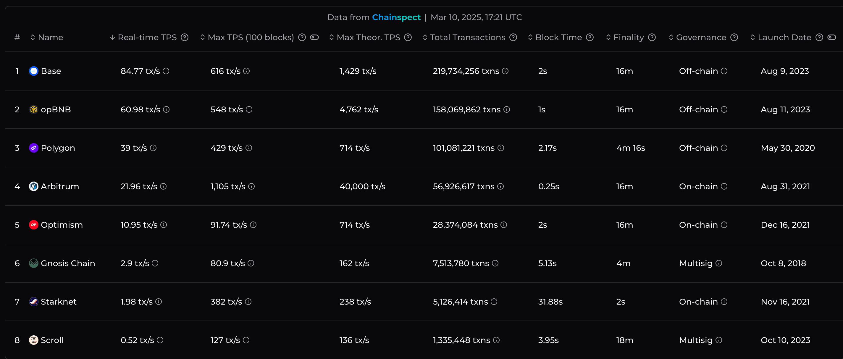 Shifting gears to the underlying performance of the L2 (not the L3 based app-chains), we can see Base is also outpacing all other rollups with an effective real-time TPS of ~85 TPS with 2 second block times.