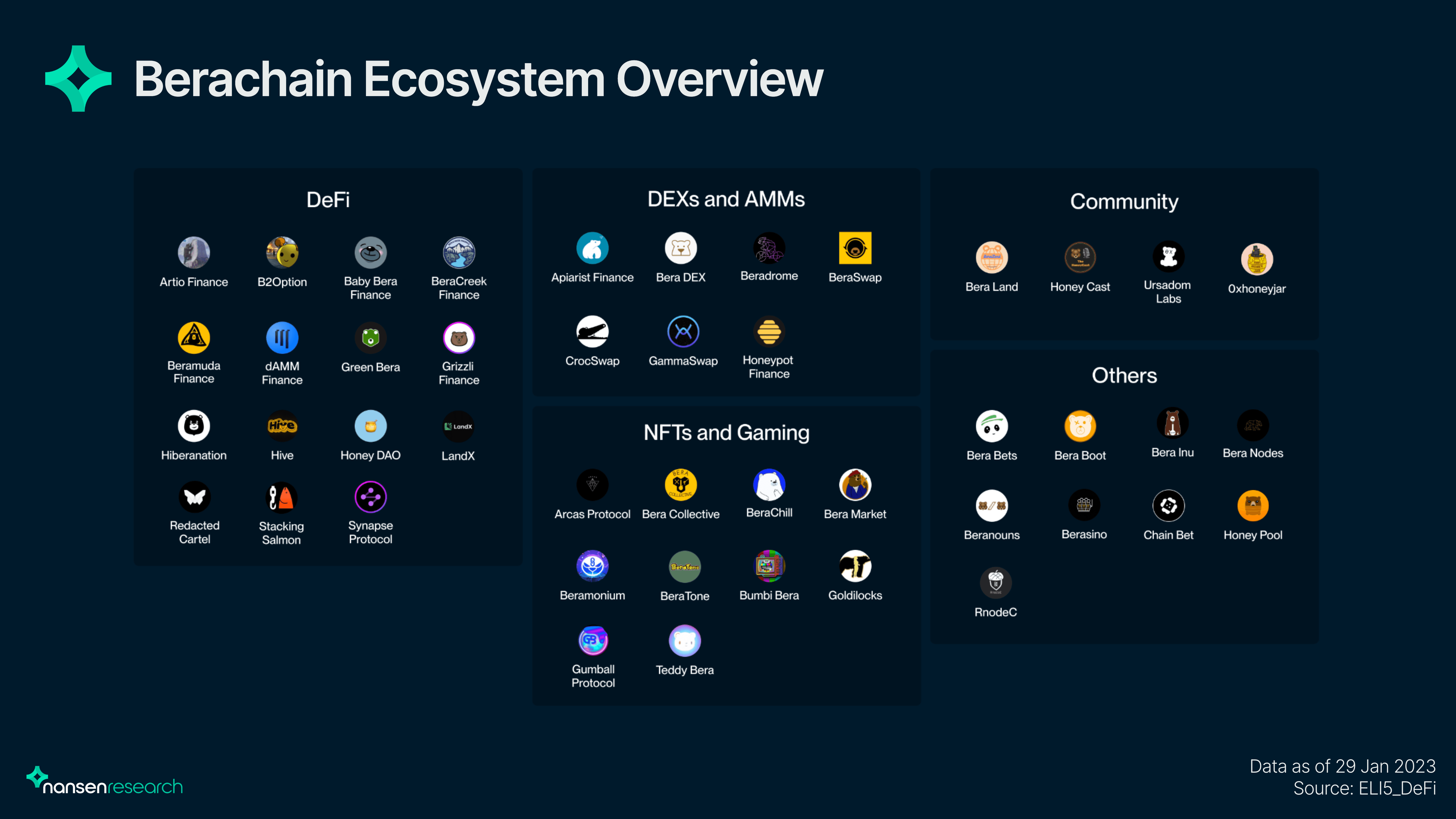 The Berachain ecosystem is highly anticipated, with prominent protocols such as Synapse, Redacted Cartel, dAMM Finance (which is actually backed by Berachain) set to launch on the chain. It also boasts a wide variety of native projects of which some have already been active in releasing its own products before the chain launch.