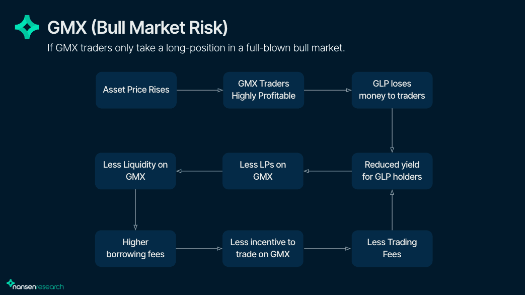 GMX gained most of its popularity during the current bear market. However, its design has not been tested in a full-fledged bull market, which could cause issues as depicted in the image above. LPs will only use GMX if trading fees more than compensate for their GLP losses. Whether GMX can withstand a potential bull market issue remains to be seen.