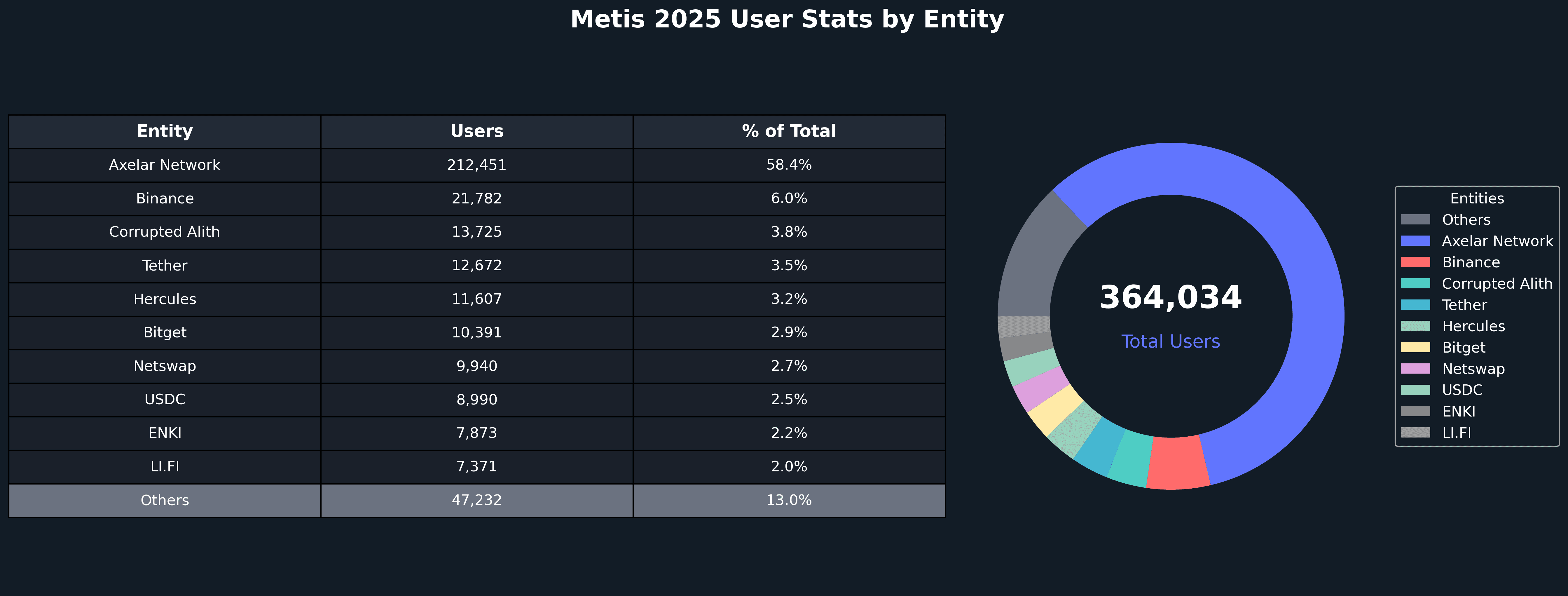 Metis's top entities by users and transactions highlight a diverse ecosystem anchored by gaming, DeFi, and cross-chain infrastructure. DeFi Kingdoms dominated transaction volume with 1.66 million transactions (31.8% of total), reflecting the platform's strong gaming presence on Metis. Netswap led DeFi activity with 1.46 million transactions (28.0% of total), while LayerZero and Axelar Network demonstrated significant cross-chain infrastructure usage. Axelar Network led in user activity with 212,451 unique users (58.4% of total), showcasing Metis's role as a cross-chain hub. The ecosystem's distribution reinforces Metis's dual role as both a high-performance gaming platform and a DeFi infrastructure layer, with cross-chain protocols serving as critical connectivity infrastructure for the expanding AI-blockchain ecosystem.