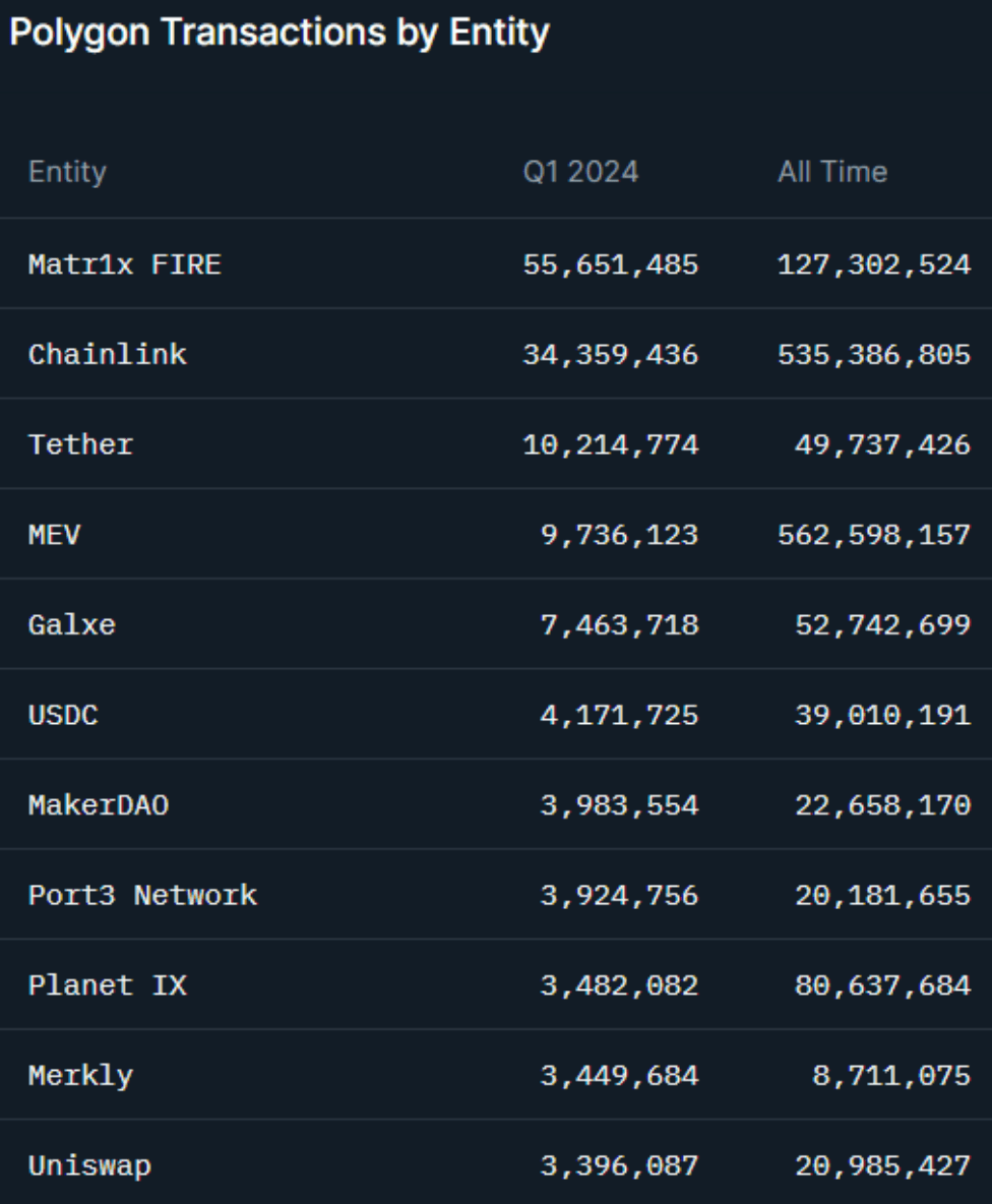 Reflecting on Q1 2024, Polygon has demonstrated impressive growth and stability, reinforcing its status as a leading blockchain platform. The network saw consistent increases in daily transactions, highlighting ongoing user engagement and adoption. Key developments, such as the Etrog and Elderberry upgrades to zkEVM and the introduction of effectiveGasPrice, have enhanced the network's functionality and appeal. Moreover, the ecosystem's expansion into sectors like DeFi, NFTs and Gaming, in particular, showcases Polygon's versatility. As the network continues to evolve, Polygon is well-positioned to support further growth and adoption, ensuring a robust and vibrant environment for its users and developers.