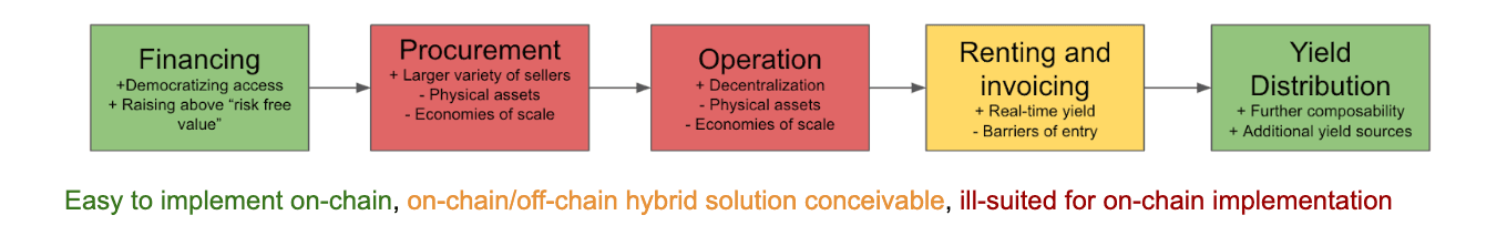 The lifecycle of AI-focused GPU financing consists of several distinct stages, each with unique challenges and characteristics, and not all are suitable for full decentralization or on-chain implementation. The chart below outlines the five major steps in this value chain and visualizes the suitability of each for on-chain implementation.