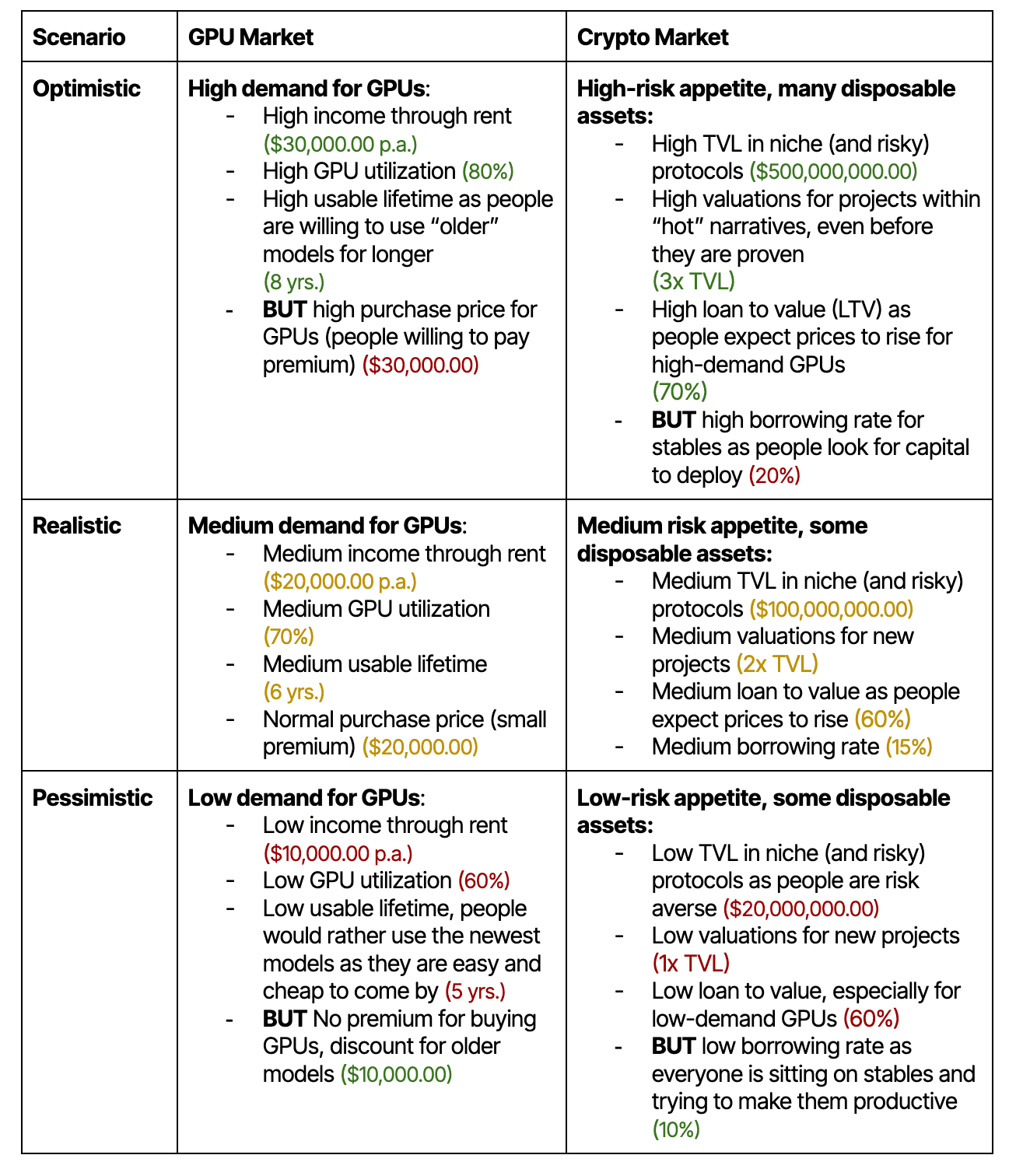 For example, financing GPU clusters or an entire project during a bull market—when GPU prices and premiums are high—followed by an immediate bear market, could result in a combination of high depreciation and low revenue. Although the current public sentiment suggests we are in a realistic scenario, such a shift could be detrimental to investors, particularly in the short term and when using leverage.
