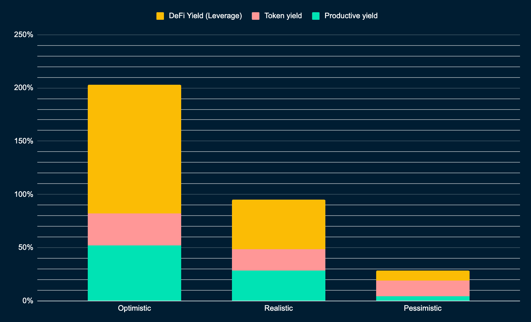 In the realistic scenario, leveraging could result in approximately 95% APR, or just under 50% when considering only productive and token yield. With around 30% coming from productive yield, this case still offers strong returns.
