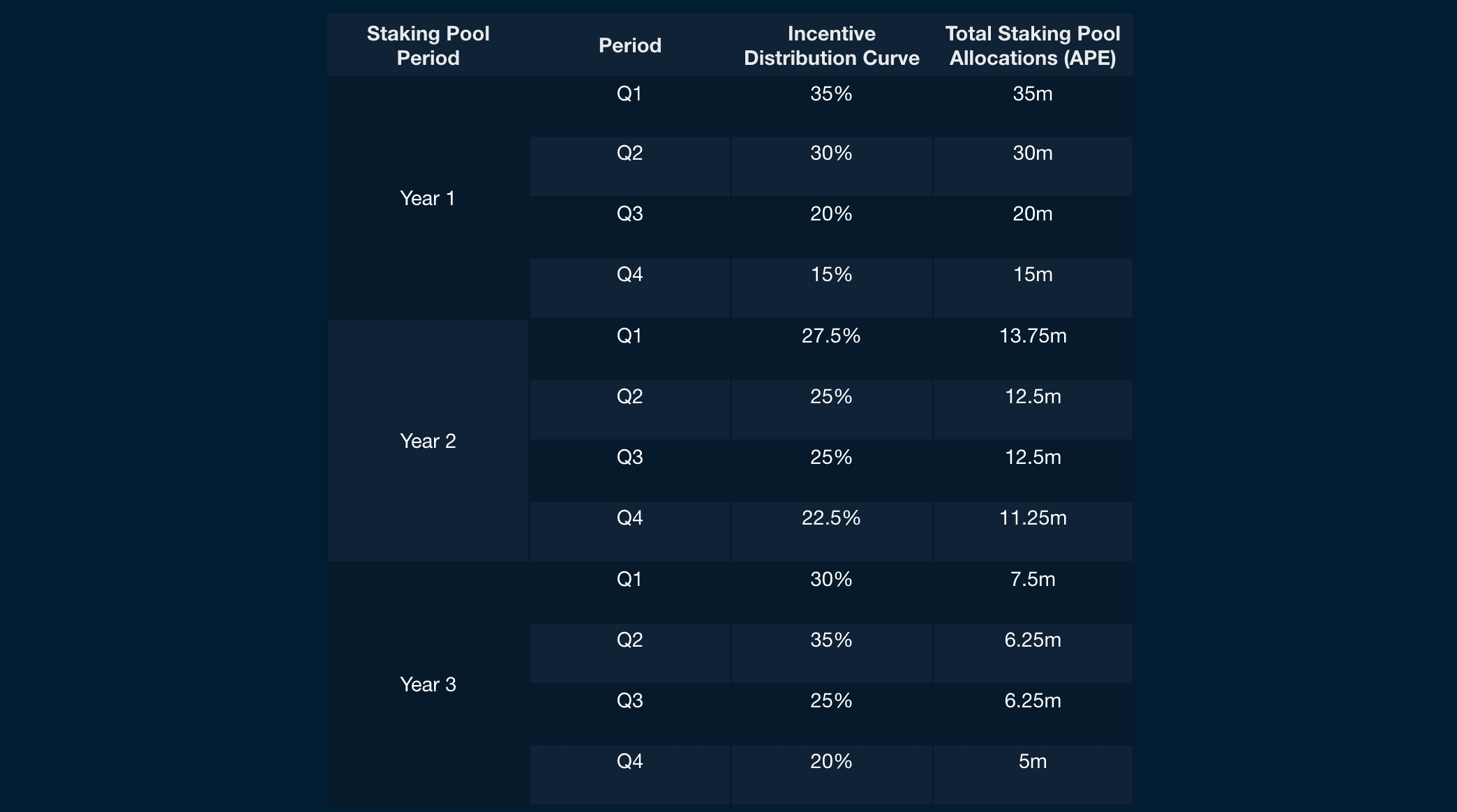 The reward system is structured such that the incentive distribution curve declines every quarter throughout the three-year duration. In other words, fewer APE tokens will be available for staking rewards after every quarter after launch. The distribution of available rewards for all three years is as follows: