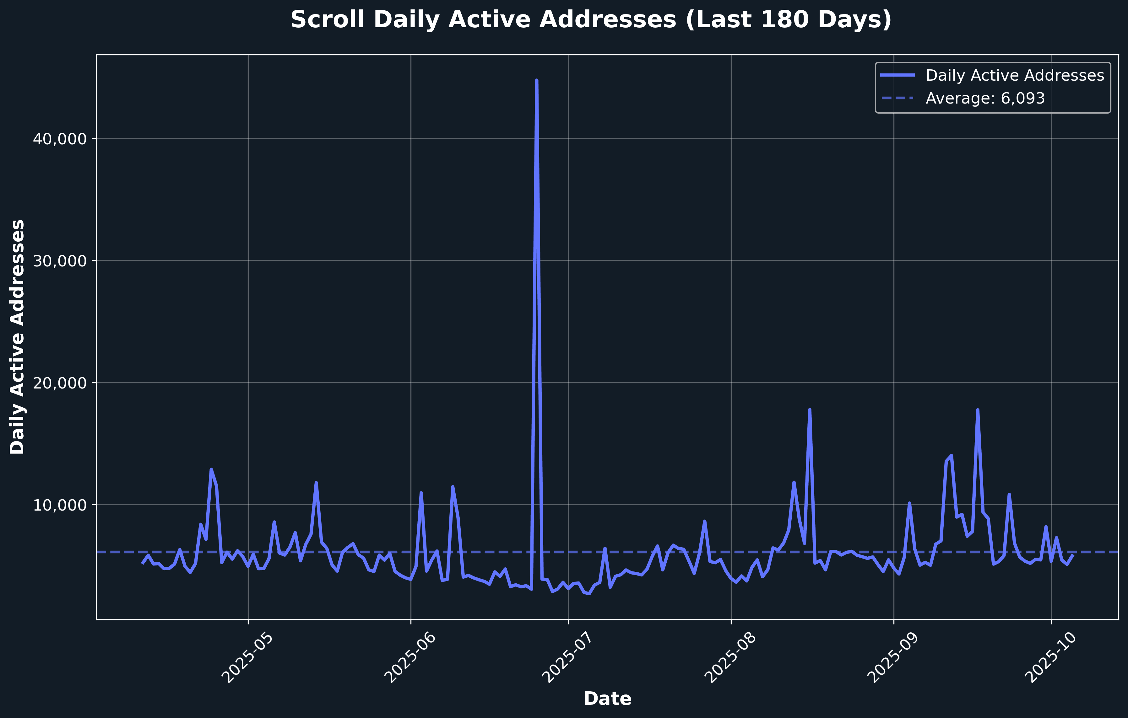 Scroll maintained a healthy base of 312,257 unique users across Q3 2025, with an average of 6,093 daily active addresses. The network experienced significant user engagement spikes, reaching peaks of 44,775 active addresses on high-activity days, while maintaining a solid floor of 2,683 users during quieter periods. This user distribution reflects Scroll's growing adoption across diverse use cases, from DeFi protocols to cross-chain bridging operations, demonstrating the network's appeal to both retail and institutional users.