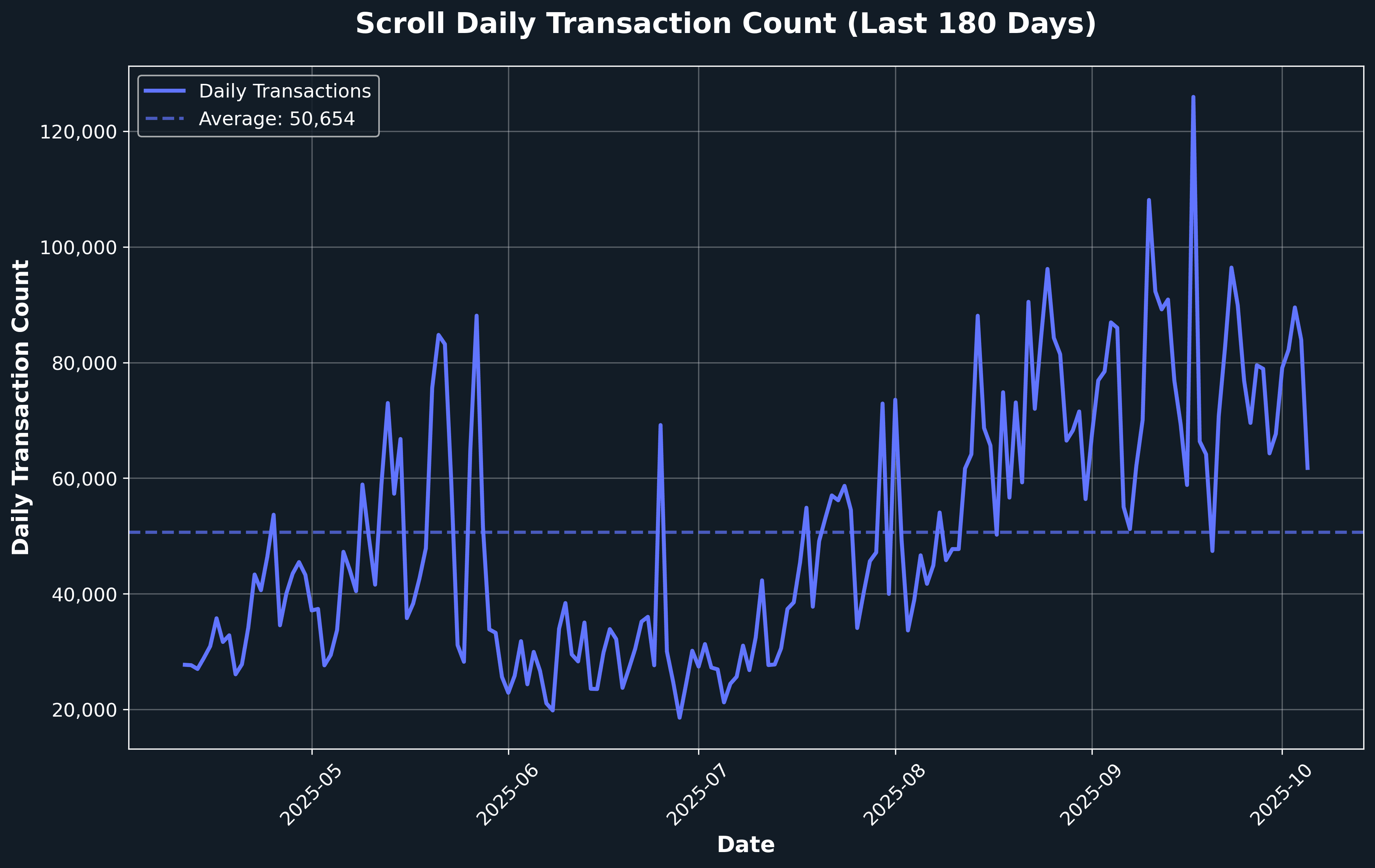 Scroll demonstrated steady transactional throughput across Q3 2025, with an average of 50,654 daily transactions. The network maintained consistent activity levels with peak performance reaching 125,949 transactions in a single day, reflecting robust protocol usage and sustained dApp engagement. Despite some volatility in daily volumes, Scroll's infrastructure proved reliable for high-throughput applications, with transaction patterns showing resilience throughout the quarter.