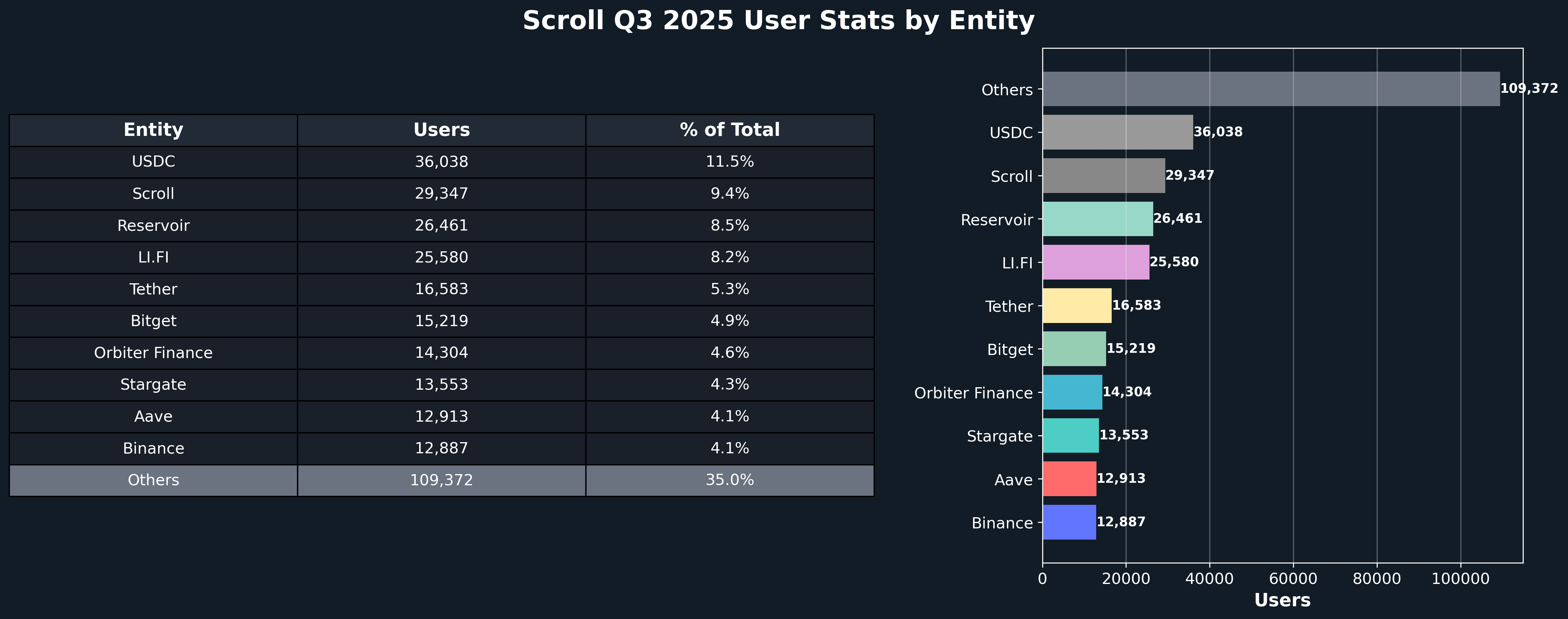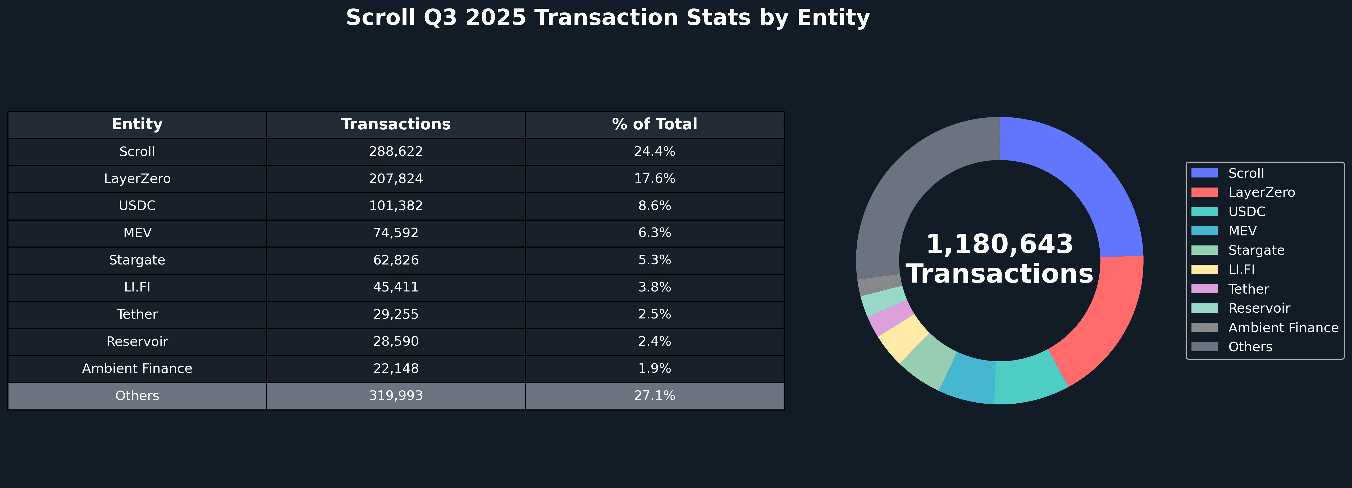 Scroll's ecosystem in Q3 2025 was anchored by core infrastructure and cross-chain protocols, with Scroll Infrastructure leading transaction volume at 288,622 transactions (24.5% of total). LayerZero followed with 207,824 transactions (17.6%), highlighting strong cross-chain demand. Notably, USDC showed significant growth (+35% transactions, +3.7% users), becoming the top user entity with 36,038 users, reflecting increased stablecoin adoption. However, most major entities experienced QoQ declines, with MEV activity dropping 46.4% and Stargate falling 58.1% in transactions, suggesting a period of market consolidation. The ecosystem's 160 active entities demonstrate Scroll's diverse utility across DeFi, bridging, and infrastructure applications.