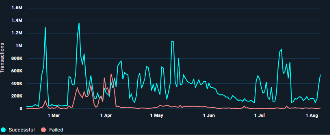 In H1 2025, Starknet’s daily successful transaction count exhibited volatility characteristic of emerging blockchain networks. Activity remained relatively steady in the 15,000-30,000 range through January and February before surging in March, when the network recorded multiple daily peaks exceeding 1 million transactions, including the half-year high of over 1.3 million. Following this peak, transaction volume entered a pronounced uptrend, fluctuating between 200,000 and 1 million transactions per day throughout April and May. By June, the trend had consolidated, stabilizing at a significantly higher baseline of 50,000-100,000 daily transactions - well above the levels observed at the start of the year.