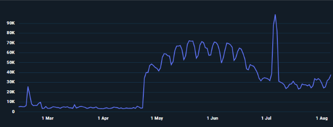 Starknet’s active addresses metric exceeded expectations in H1 2025, reflecting strong user growth amid a volatile market. Early in the year, daily active addresses held steady in the 5,000-10,000 range, occasionally spiking above 20,000. Beginning in mid-April, activity surged sharply, establishing a sustained upward trend that quickly stabilized in the 50,000-70,000 range. This elevated baseline persisted through the end of H1, underscoring Starknet’s accelerating adoption and expanding presence in the blockchain ecosystem.