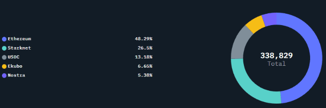 In H1 2025, Starknet strengthened its position as one of the most prominent emerging Ethereum Layer 2 solutions in the industry. User activity data shows that nearly 50% of unique users during the period engaged in Ethereum trading or transfers, underscoring Starknet’s role as a core L2 environment. Native Starknet transactions ranked second, capturing over 26.5% of the user share. The remainder of the Top 5 was dominated by DeFi activity, Ekubo - one of Starknet’s largest decentralized exchanges - and Nostra, a comprehensive DeFi super-app offering lending, borrowing, pooling, and token swaps, which accounted for more than 5% of total users.