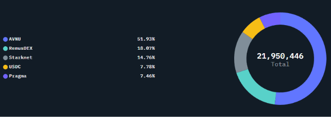On the transactions front, DeFi led decisively. AVNU, a trading and staking hub, commanded over 50% of the more than 22 million transactions recorded during the period. RemusDEX followed with an 18% share, trailed by native Starknet transactions, while USDC and Pragma - a decentralized oracle - rounded out the Top 5, with the latter capturing 7.5% of total transaction volume.