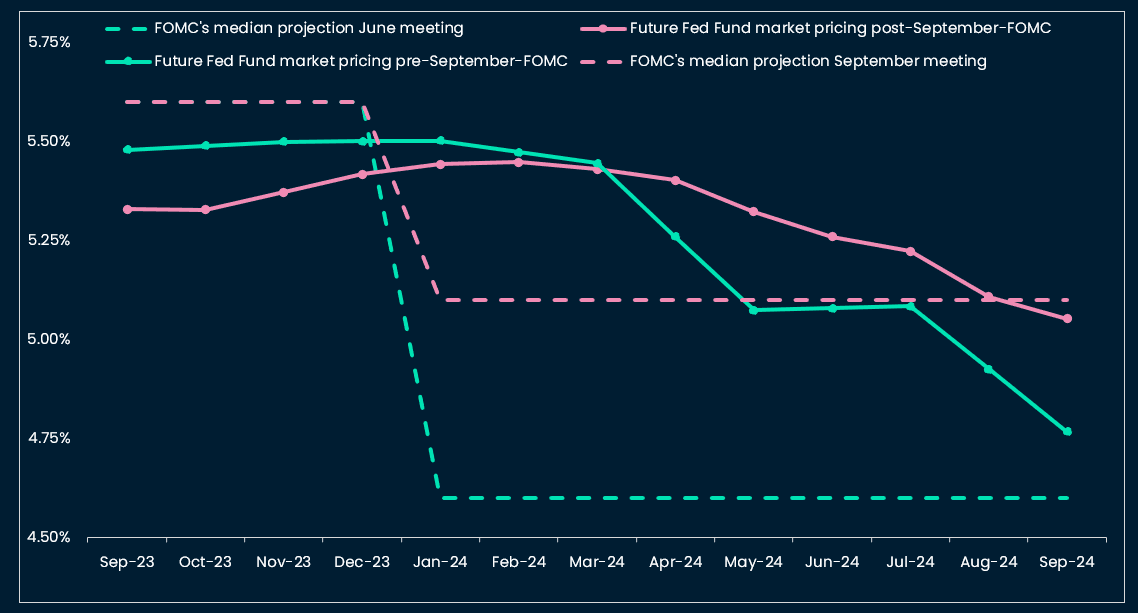 The next phase of monetary policy for the US Fed and MM central banks is holding rates steady. “High-for-longer” has now been imprinted in the mind of investors, and is being more and more reflected by asset prices. Last week’s most notable message from the FOMC meeting was that rate cuts would not occur as fast and as early as thought: the FY 2024 policy rate was seen by the Committee at 5.1% vs 4.6% during the June projections.