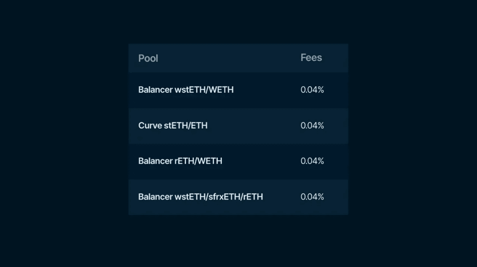 The vdAMM charges fees between 0-2%, depending on the target weights of each asset. Today, the typical swap fee for LSD to ETH among the largest pools is 0.04%.