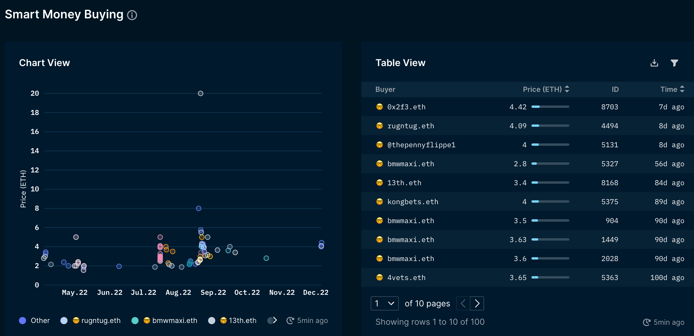 Once we have identified the individual Smart Money wallets that have traded the NFTs, we can cross-check with the Top Balances by filtering for Smart Money to study whether they are a notable or sizable collector of the collection. The Top Balances table should serve as the central source of information to gauge the size of impact from a specific Smart Money wallet based on their trading activity. For example, if a top 5 Smart Money holder has drastically decreased their position in a short period of time, then it could suggest that we should also consider taking some profits.